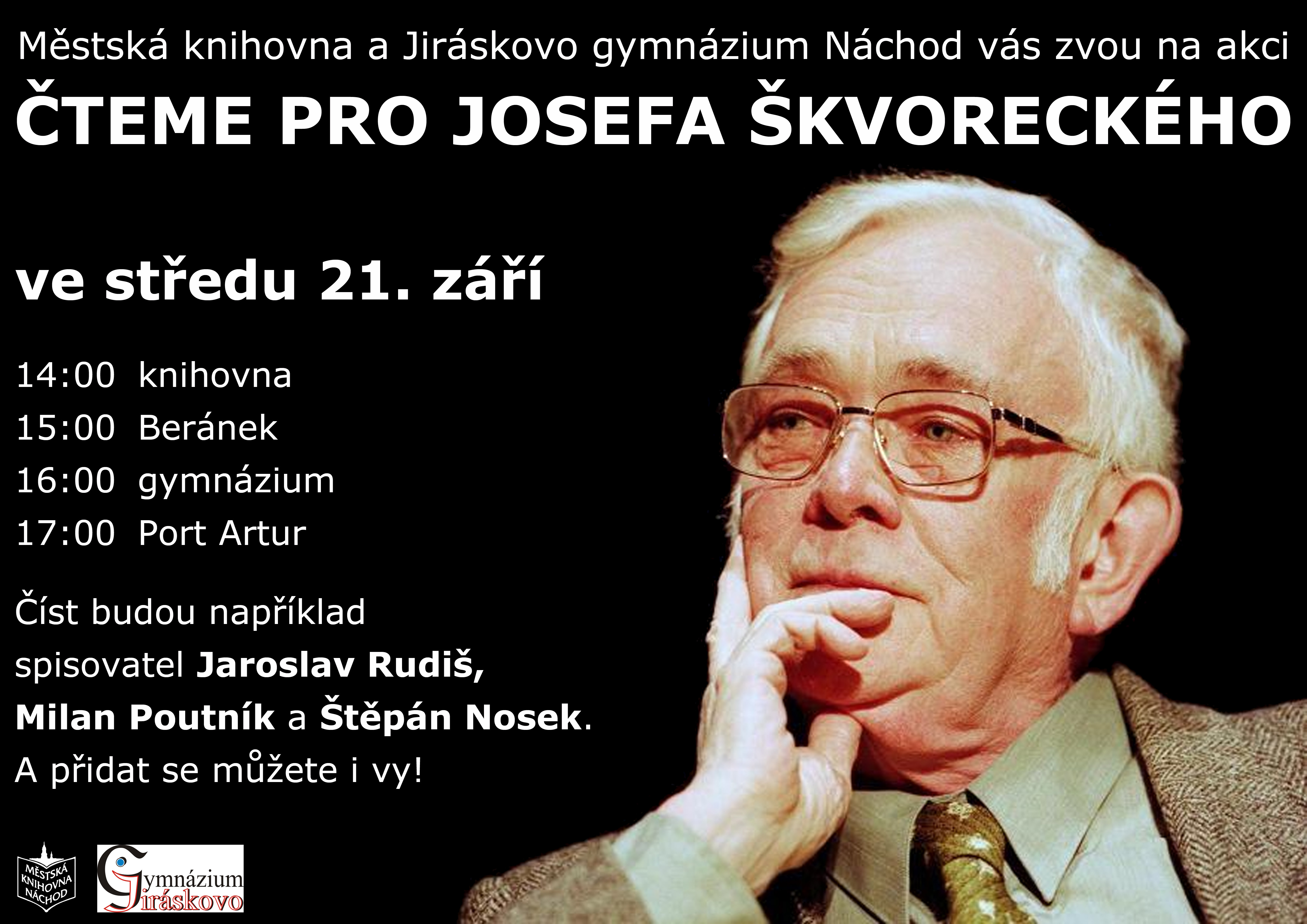 V září letošního roku si připomeneme dvaadevadesáté výročí narození jednoho z mála světově známých náchodských rodáků Josefa Škvoreckého. Zveme všechny milovníky „Danny Smiřického a jeho Kostelce" na čtení, které se bude konat ve středu 21. září. Naším vzácným hostem a předčítačem bude milovník jeho díla, spisovatel Jaroslav Rudiš. Číst začneme ve 14 hodin v knihovně, v 15 hodin budeme poslouchat v Dannyho kavárně v hotelu Beránek, v 16 hodin bude čtení pokračovat na Jiráskově gymnáziu. Poslední zastávkou bude nezapomenutelný hostinec Port Artur, kde začne číst přibližně v 17 hodin. Máte-li i vy v oblibě tohoto autora, neváhejte, vyberte vám blízkou ukázku a přijďte se o ni s ostatními podělit.