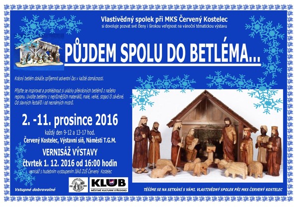 Vlastivědný spolek Červený Kostelec ve spolupráci s Městským kulturním střediskem Červený Kostelec a Městem Červený Kostelec pořádá svou další tradiční červenokosteleckou výstavu - tentokráte na téma betlémů a jejich tradice u nás.