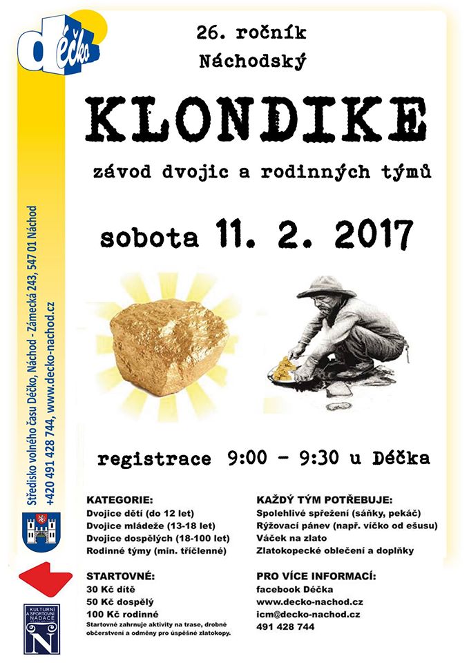 26. ročník Náchodského Klondiku odstartuje v sobotu 11. února 2017 od 9 hodin. Registrace týmů bude probíhat od 9 do 9.30 hodin v Déčku.