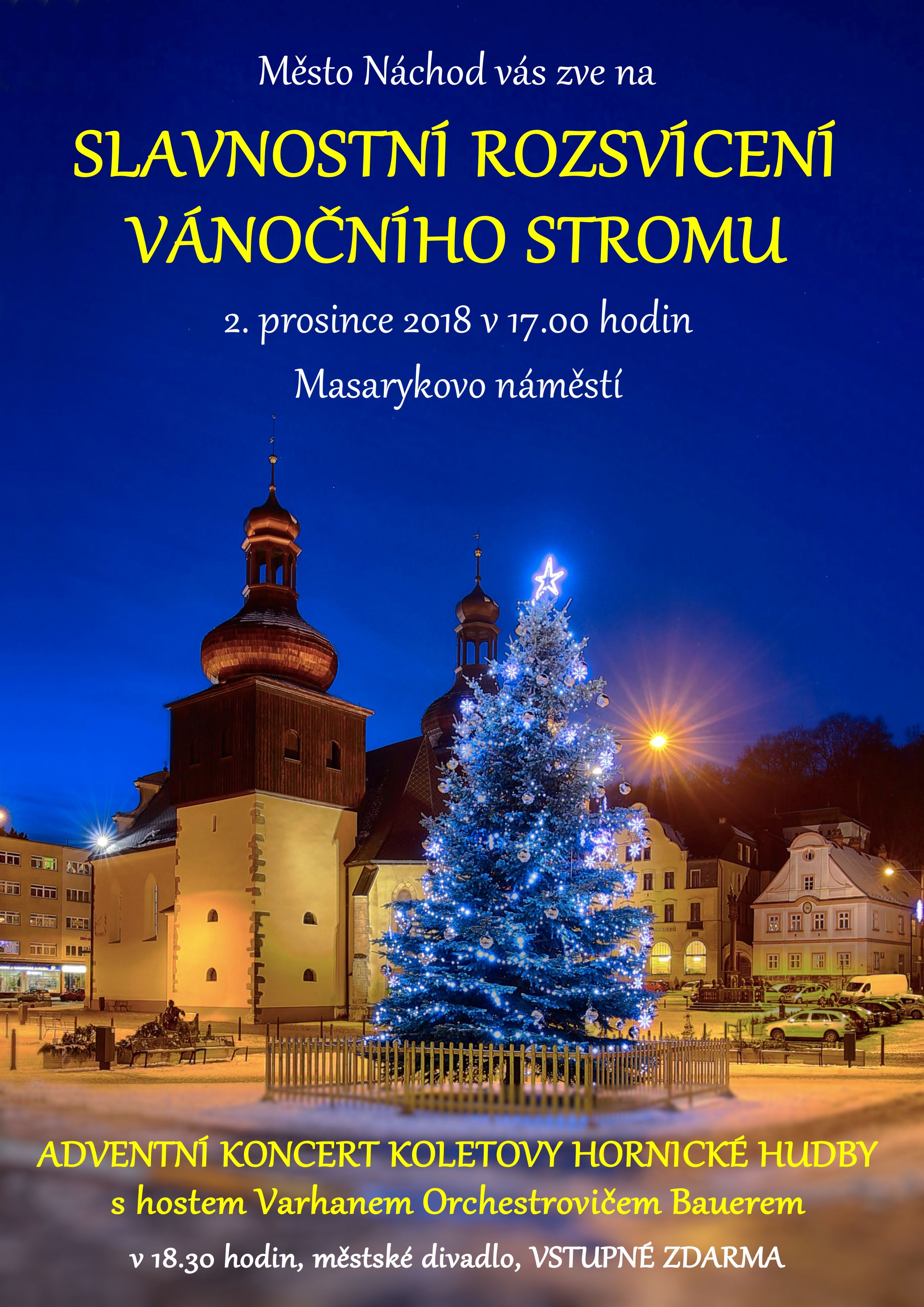 Město Náchod si vás dovoluje pozvat na slavnostní rozsvícení vánočního stromu, které se uskuteční v neděli 2. prosince 2018 v 17 hodin na Masarykově náměstí.