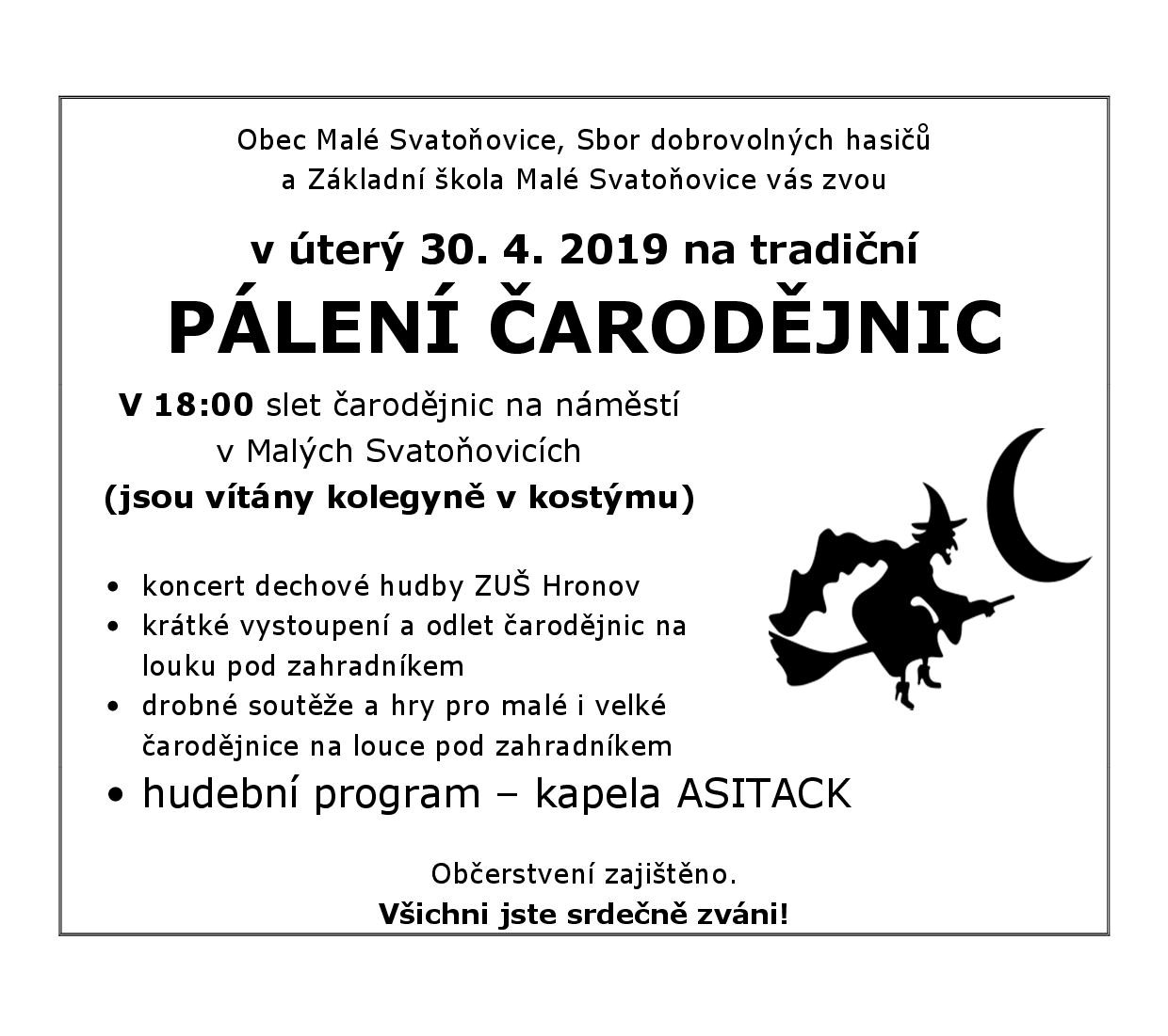 V úterý 30. dubna 2019 slet v 18.00 hod. na náměstí Karla Čapka v Malých Svatoňovicích.
