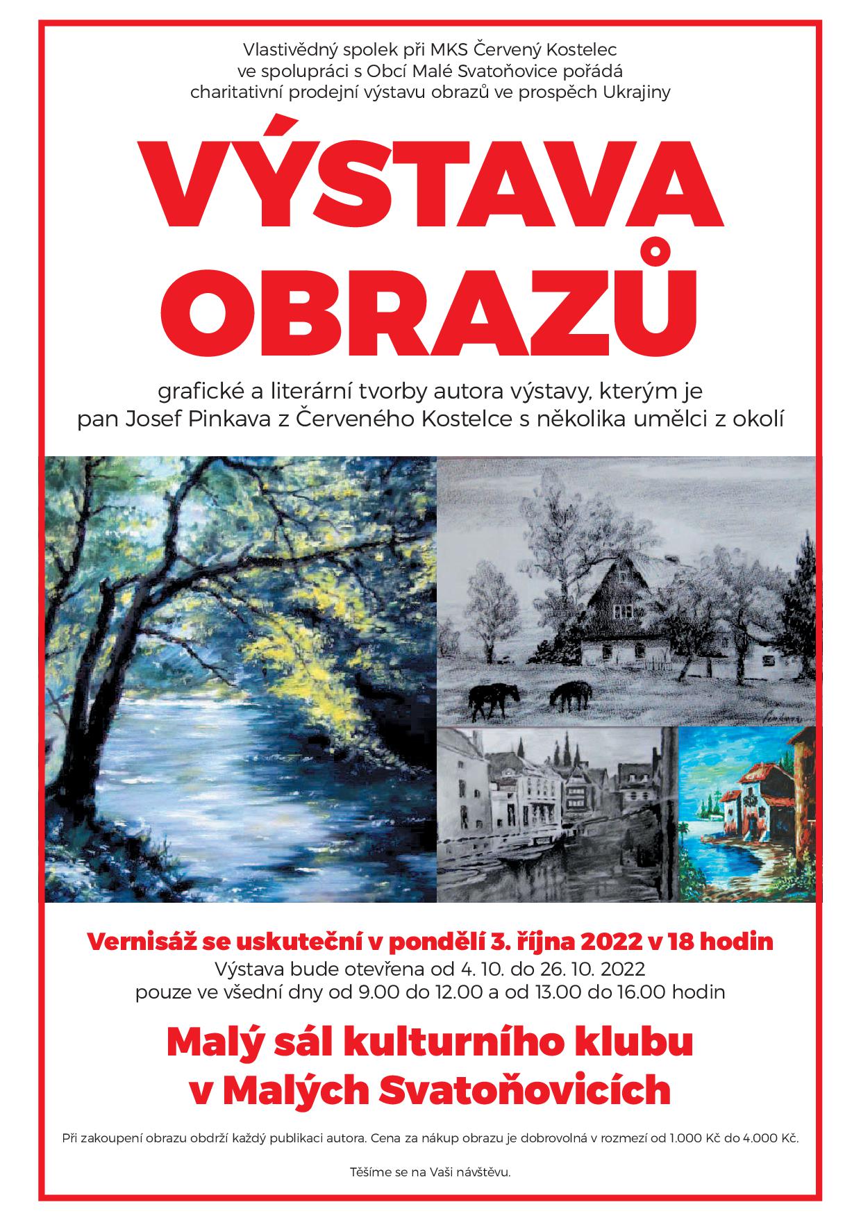 Obec Malé Svatoňovice Vás zve na charitativní prodejní výstavu obrazů pana Josefa Pinkavy.