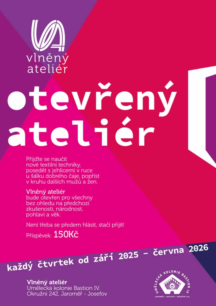 Přijďte se naučit nové textilní techniky, posedět s jehlicemi v ruce u šálky dobrého čaje každý čtvrtek od 16:00 do 19:00 ve Vlněném ateliéru v Jaroměři