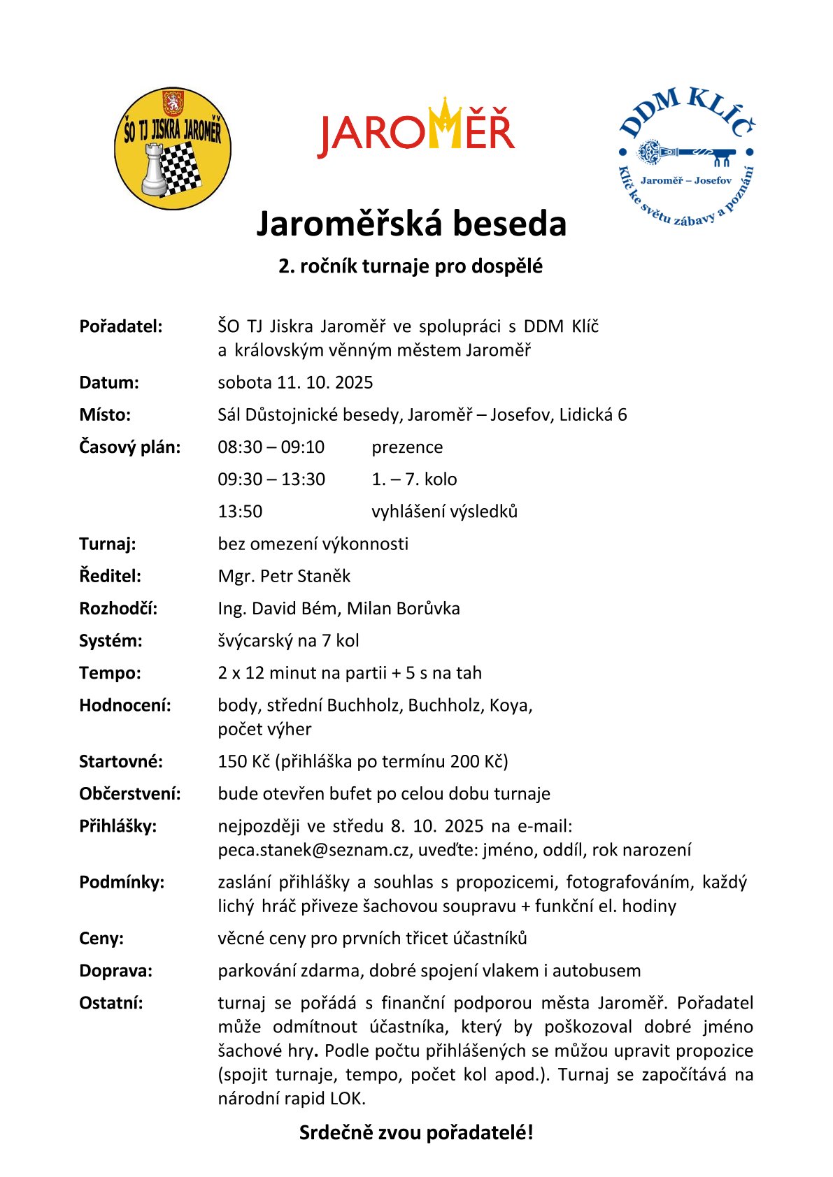 Druhý ročník šachového turnaje pro dospělé se uskuteční 11. října 2025 v Jaroměři. Pořadatelé ŠO TJ Jiskra Jaroměř a DDM Klíč zvou všechny zájemce o šachy. Turnaj je otevřený bez omezení výkonnosti a bude se hrát švýcarským systémem na 7 kol. Registrace probíhá do 8. října, startovné činí 150 Kč. Občerstvení zajištěno po celou dobu akce.