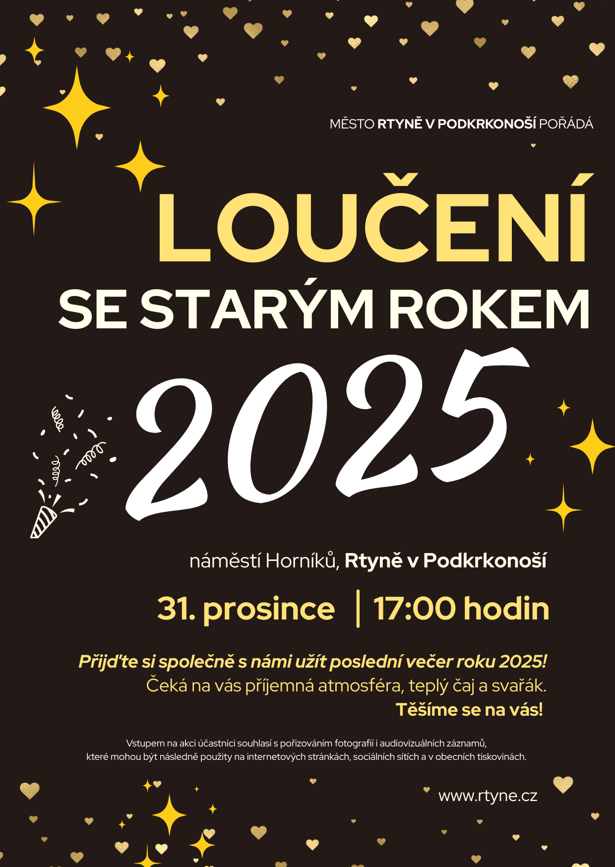 Přijďte se společně rozloučit se starým rokem 2025 na náměstí Horníků u nás ve Rtyni v Podkrkonoší a to tradičně 31.12.2025 od 17:00! Těšíme se na vás!