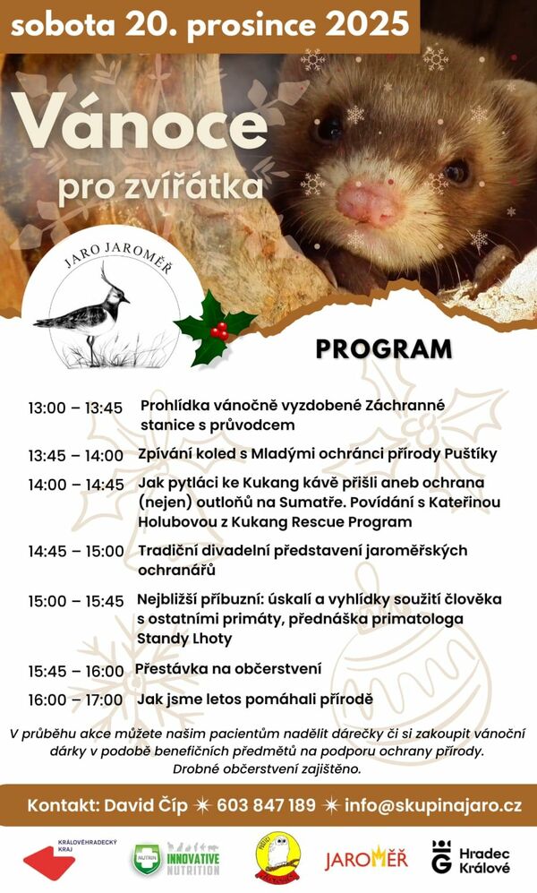 Přijďte si užít vánoční atmosféru v záchranné stanici, kde se můžete těšit na prohlídku s průvodcem, zpívání koled a zajímavé povídání o ochraně přírody. Na programu je také divadelní představení a přednáška o soužití člověka s primáty. Drobné občerstvení je zajištěno.