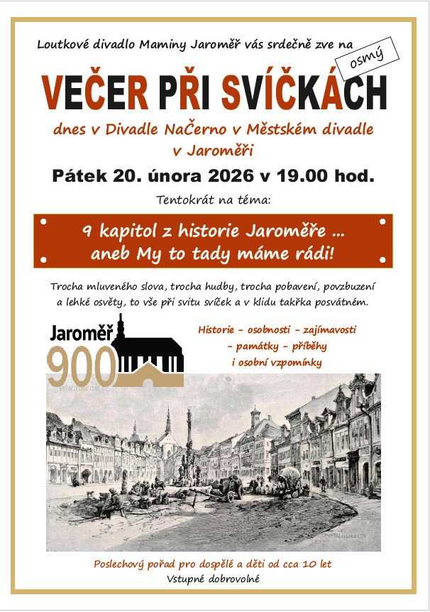 Loutkové divadlo Maminy Jaroměř vás zve na Večer při svíčkách, který se koná tentokrát v Divadle NaČerno. Akce se zaměří na historii Jaroměře, zahrnující mluvené slovo, hudbu a pobavení. Přijďte si užít příjemnou atmosféru svíčkového osvětlení a poslechnout si zajímavé příběhy a osobní vzpomínky. Pořad je určen pro dospělé a mladé lidi od cca 10 let.