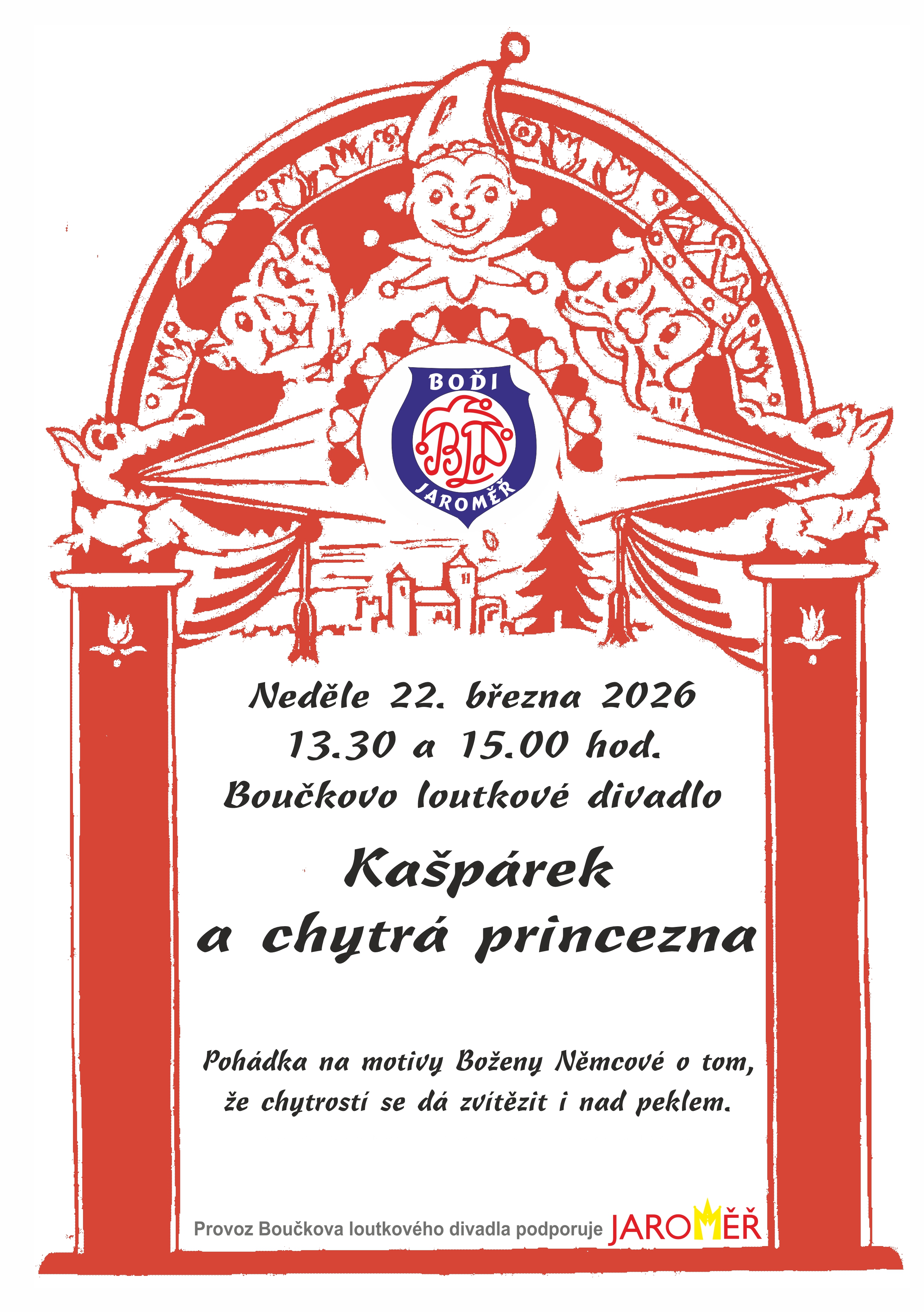 Přijďte se podívat na pohádku "Kašpárek a chytrá princezna", která se koná v neděli 22. března 2026 ve Boučkově loutkovém divadle. Představení se uskuteční ve dvou termínech, a to v 13:30 a 15:00 hodin. Tato pohádka, inspirovaná dílem Boženy Němcové, vypráví o tom, jak chytrost může přemoci i ta největší úskalí, včetně pekla. Srdečně zveme všechny, kteří mají rádi loutkové divadlo a pohádky.