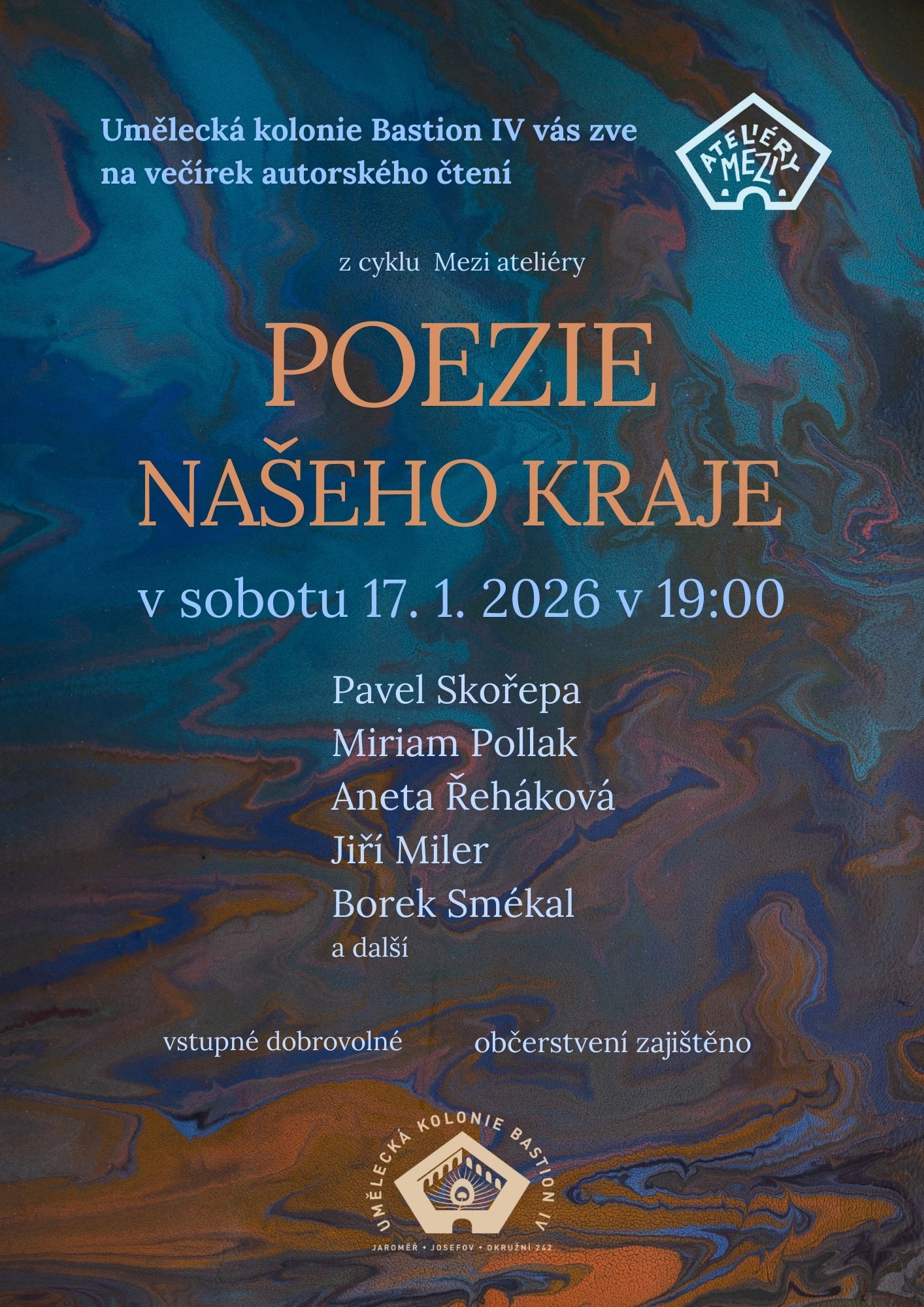 Umělecká kolonie Bastion IV pořádá večírek autorského čtení z cyklu Mezi ateliéry. Akce se bude konat v sobotu 17. ledna 2026 v 19:00. Těšit se můžete na poezii našeho kraje, kterou představí autoři jako Jiří Miler a další. Přijďte si poslechnout výjimečné literární kousky a podpořit místní tvůrce.