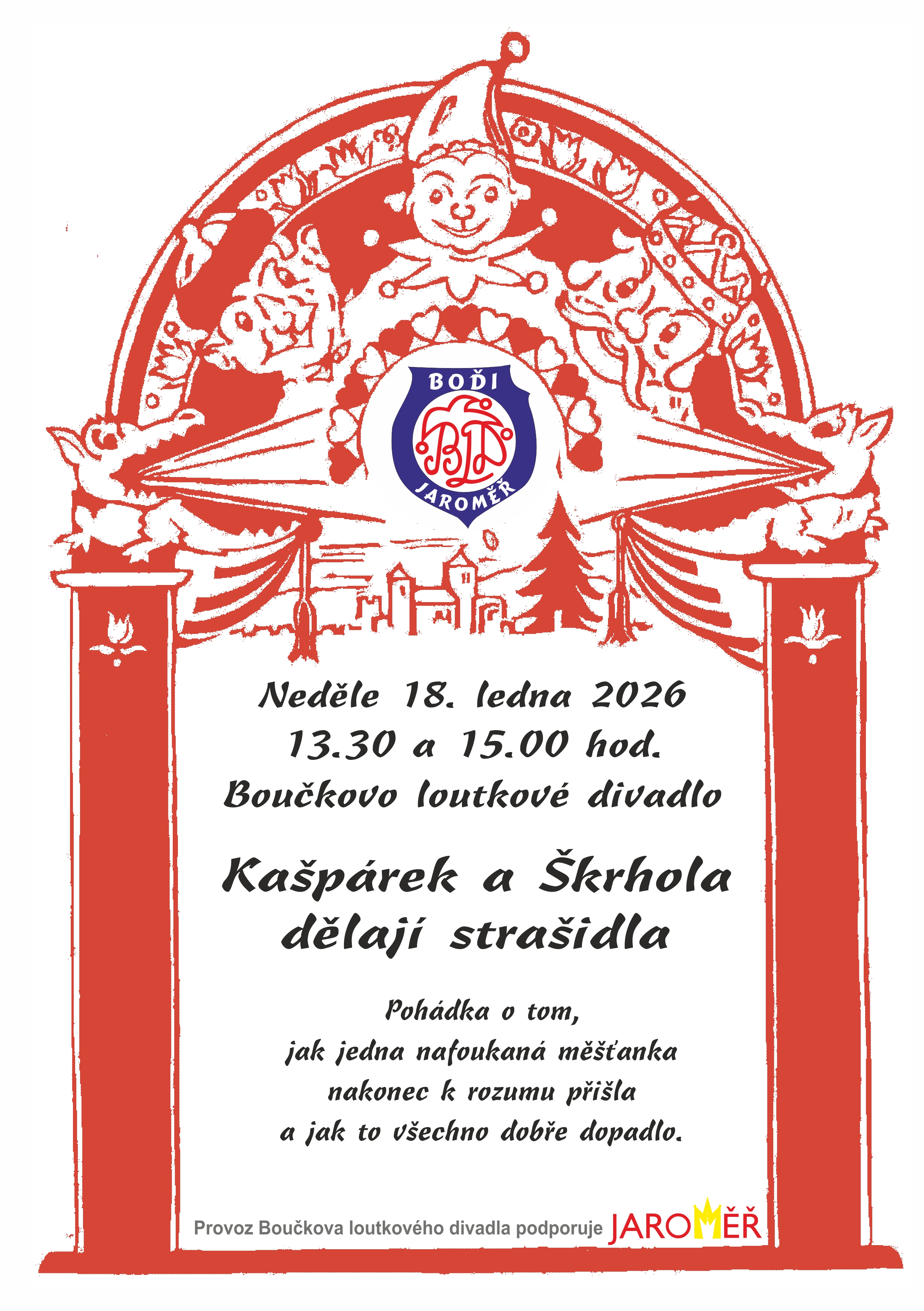 Pohádka 'Kašpárek a Skrhola' v Boučkově loutkovém divadle se koná v neděli 18. ledna 2026 ve dvou představeních. První představení začíná ve 13:30 a druhé v 15:00 hodin. Tato pohádka vypráví příběh o nafoukané měšťance, která se nakonec dostává k rozumu a vše dobře končí. Diváci se mohou těšit na zábavné strašidelná dobrodružství, která pobaví děti i dospělé.