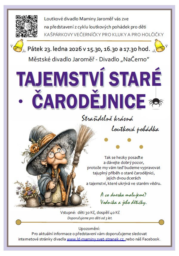 Loutkové divadlo Maminy Jaroměř vás srdečně zve na představení z cyklu loutkových pohádek pro děti s názvem 'Kašpárkovy večerníčky pro kluky a pro holčičky'. Těšit se můžete na tajuplný příběh o staré čarodějnici, jejích dvou dcerách a tajemství, které ukrývá ve starém vědru. Představení se uskuteční v pátek 23. ledna 2026 ve třech časech - 15:30, 16:30 a 17:30 hodin v Městském divadle Jaroměř - Divadlo 'NaČerno'. Doporučeno pro děti od 3 let.