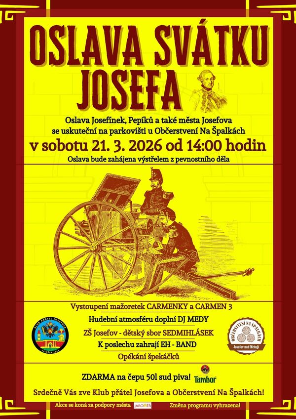 Zveme vás na jedinečné odpoledne plné zábavy a hudby, které se koná 21. března 2026 od 14:00 hodin v Josefově. Těšit se můžete na vystoupení mažoretek a hudební kupiny EH-BAND. Dětský sbor SEDMIHLÁSEK přispěje k příjemné atmosféře. Akce je zdarma a bude k dispozici občerstvení, včetně opékání špekáčků a sudu piva. Přijďte si užít skvělou zábavu s rodinou a přáteli.