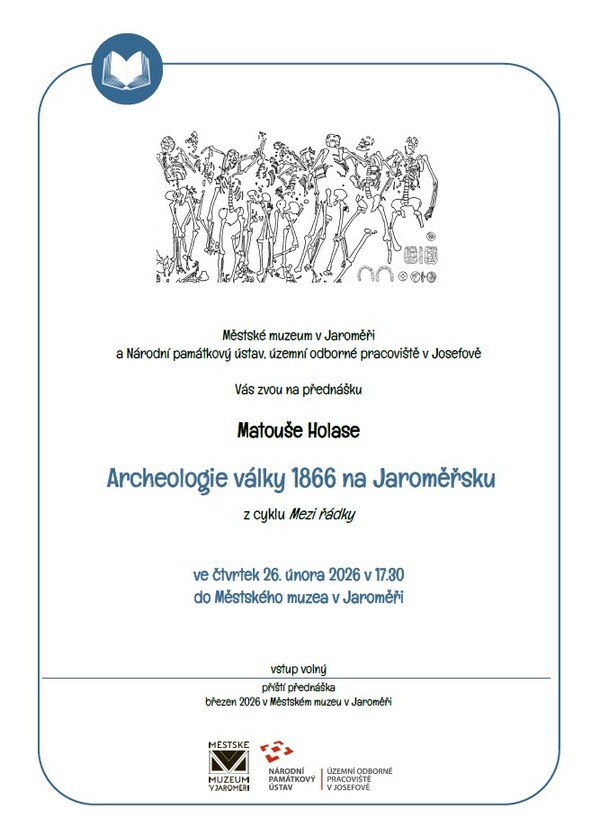 Městské muzeum v Jaroměři a Národní památkový ústav vás zvou na přednášku Matouše Holase o archeologii války 1866 na Jaroměřsku. Akce se koná ve čtvrtek 26. února 2026 v 17:30 v Městském muzeu v Jaroměři. Vstup na přednášku je volný.