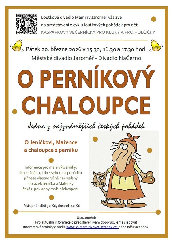 Loutkové divadlo Maminy Jaroměř vás zve na představení z cyklu loutkových pohádek pro děti. Těšit se můžete na příběh o Jeníčkovi, Mařence a chaloupce z perníku. Představení se koná 20. března 2026 ve třech časových blocích: v 15:30, 16:30 a 17:30 hodin. Pro malé výtvarníky je připravena soutěž, ve které čeká na každého, kdo přinese vlastnoručně nakreslený obrázek Jeníčka a Mařenky, malé překvapení. Nezapomeňte sledovat internetové stránky divadla pro aktuální informace.
