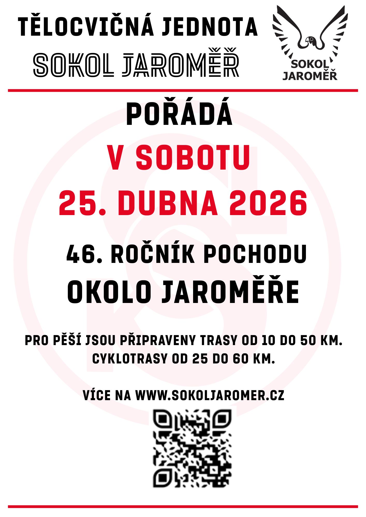 Tělocvičná jednota Sokol Jaroměř pořádá 46. ročník pochodu kolem Jaroměře. Akce se koná v sobotu 25. dubna 2026. Pro pěší účastníky jsou připraveny trasy v délce od 10 do 50 km a pro cyklisty cyklotrasy od 25 do 60 km. Tato akce je skvělou příležitostí pro aktivní trávení volného času v přírodě.